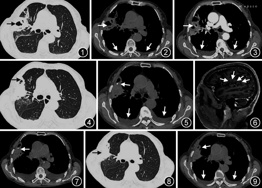 2022年2月27日患者出现神志恍惚、谵妄,急查血气(吸氧浓度33%)示pH值7.56,二氧化碳分压30 mmHg,总二氧化碳分压27.80 mmHg,剩余碱4.7 mmol/L,标准碳酸氢盐29.00 mmol/L,钠111.00 mmol/L、氯78 mmol/L,患者呼吸性碱中毒合并代谢性碱中毒,考虑摄入不足及感染消耗所致低钠低氯血症并出现意识状态改变;治疗后复查血常规:N%为67.60%,NEU为3.48×109/L,Lym%为22.80%,Lym为1.67×109/L,淋巴细胞恢复正常;胸部CT可见右肺上叶空洞性病变较前缩小(图4,5),颅脑MRI及增强可见脑内多发斑点状、小结节状异常强化影(图6),感染性病变与转移瘤待鉴别,因家属拒绝创伤性检查,且亚胺培南难于透过血脑屏障,遂调整为美罗培南(1 g,1次/8 h)继续抗感染,行PET-CT检查见右肺上叶高密度影并FDG代谢增高(图7)、脑内异常FDG代谢增高灶、右侧侧脑室后角局限显示欠清并FDG代谢增高,均考虑感染所致;双肾FDG代谢欠均匀,不除外感染。至此,考虑患者存在肺脓肿、颅脑感染、尿路感染,但致病菌不明确。为明确致病菌行腰椎穿刺术,并留取脑脊液送基因二代测序(next generation sequencing,NGS)。3月11日脑脊液NGS结果回示诺卡菌属(序列数7),豚鼠耳炎诺卡菌(序列数6)。根据PET-CT检查及脑脊液NGS结果,患者豚鼠耳炎诺卡菌病血流感染诊断明确,已播散至肺、脑、肾多部位,加用足量磺胺甲噁唑/甲氧苄啶(SMZ,2.4 g,1次/6 h)治疗。患者治疗后复查血常规、电解质、肝肾功能均未见异常;胸部及输尿管全程CT示右肺上叶空洞性病变较前略减小(图8,9);输尿管全程未见异常。于2022年3月16日好转出院,出院后继续口服利奈唑胺和SMZ治疗。4月28日患者胸部CT示右肺上叶空洞性病变明显减小;自6月4日停用利奈唑胺,口服SMZ(0.96 g,1次/6 h)维持治疗6个月,出院6个月及1年后电话随访,患者一般情况良好,病情未复发。
