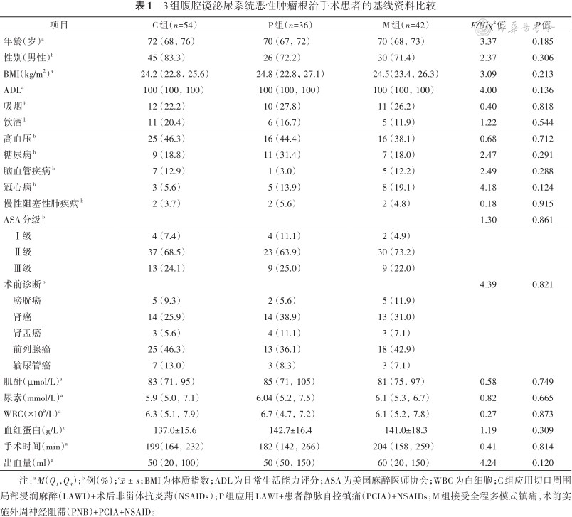 注:aM(Q1,Q3);b 例(%);c;BMI为体质指数;ADL为日常生活能力评分;ASA为美国麻醉医师协会;WBC为白细胞;C组应用切口周围局部浸润麻醉(LAWI)+术后非甾体抗炎药(NSAIDs);P组应用LAWI+患者静脉自控镇痛(PCIA)+NSAIDs;M组接受全程多模式镇痛,术前实施外周神经阻滞(PNB)+PCIA+NSAIDs