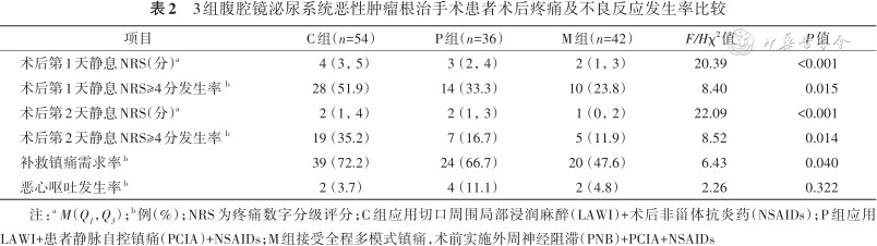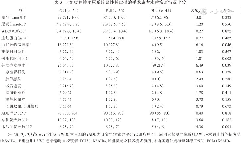 M组患者术后第1、2天的静息NRS[M(Q1,Q3)]分别为2(1,3)、1(0,2)分,均低于C组的4(3,5)、2(1,4)分及P组的3(2,4)、2(1,3)分(均P<0.001);M组患者术后第1、2天静息NRS≥4分发生率为23.8%(10/42)、11.9%(5/42),均低于C组的51.9%(28/54)、35.2%(19/54)及P组的33.3%(14/36)、16.7%(7/36)(均P<0.05);M组患者术后48 h内补救镇痛需求率、助眠药物需求率、并发症发生率、术后住院天数分别为47.6%(20/42)、9.5%(4/42)、21.4%(9/42)、5(4,6)d,均低于C组的72.2%(39/54)、29.6%(16/54)、46.3%(25/54)、6(5,9)d及P组的66.7%(24/36)、27.8%(10/36)、27.8%(10/36)、6(5,7)d(均P<0.05)。3组患者术后恶心呕吐发生率、实验室指标、排便时间、引流管拔除时间、出院ADL评分及总住院天数差异均无统计学意义(均P>0.05)。