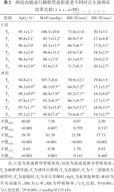 两组内镜逆行胰胆管造影患者不同时点生命体征结果比较(,n=58)