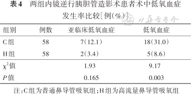 两组患者亚临床低氧血症发生率差异无统计学意义(P=0.165);H组患者低氧血症发生率低于C组(P=0.003),见表4。两组患者术中均未发生严重低氧血症。