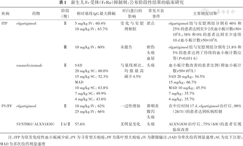 1.原发免疫性血小板减少性紫癜(primary immune thrombocytopenic,ITP):ITP是由抗体介导的血小板破坏、合并血小板生成障碍引起的疾病,是儿童和成人血小板减少的一个罕见原因,特征是血小板计数低(<100 × 109/L),临床表现通常为出血和(或)瘀伤[9]。ITP的发病机制主要是自身抗体和细胞毒性T细胞(CD8+T细胞)介导抗血小板反应,导致血小板清除加快及CD8+T细胞靶向骨髓巨核细胞抑制血小板生成[9, 10],导致体内血小板含量降低。(1)efgartigimod:Ⅰ期临床研究中,单次输注efgartigimod可使健康志愿者的IgG水平降低50%,而多次给药可使IgG降低75%,在末次给药后约8周,受试者IgG水平才恢复到基线水平[11]。一项efgartigimod治疗ITP安全性和有效性的随机、双盲、安慰剂对照的Ⅱ期临床研究结果显示:efgartigimod可诱导总IgG水平快速降低,与基线水平相比,5 mg/kg组和10 mg/kg组中IgG水平最大降低值分别为60.4%和63.7%,而安慰剂组没有明显改变[12]。血小板计数增加与IgG水平降低具有临床相关性,在至少连续10 d内,efgartigimod组中38%患者达到血小板计数≥50×109/L,而安慰剂组为0%。同时,efgartigimod降低了患者的出血事件发生率,其安全性和耐受性与之前的Ⅰ期研究结果相似[12]。efgartigimod是全球首个获批临床应用的FcRn抑制剂,在第64届美国血液学学会年会上以口头报告的形式公布了其治疗ITP的全球Ⅲ期研究结果。研究达到了主要终点,efgartigimod组21.8%的患者达到了持续的血小板计数应答,而安慰剂组仅为5%(P=0.031 6)[13],其中持续血小板计数应答被定义为:在第19~24周的6次随访中至少有4次血小板计数达到≥50×109/L。此外,该研究也达到了相关的次要研究终点;观察到的安全性和耐受性数据与Ⅰ期和Ⅱ期研究一致。一项评估皮下注射(subcutaneous,SC)efgartigimod治疗原发性ITP安全性和有效性的Ⅲ期临床研究(NCT04687072)已经启动。上述研究结果将为efgartigimod用于ITP患者的治疗开启希望之门,拓宽其应用范围和领域。(2)rozanolixizumab:在Ⅰ期临床研究中rozanolixizumab可降低健康志愿者的血清IgG水平[14];治疗ITP的Ⅱ期临床研究也取得了积极的阳性结果,该研究是一项多中心、随机、双盲、安慰剂对照研究,共纳入66例持续性或慢性原发性ITP患者,随机分为单剂量组(20 mg/kg和15 mg/kg)和多剂量组(2×10 mg/kg、3×7 mg/kg和5×4 mg/kg),来评价rozanolixizumab的安全性、耐受性及疗效[15]。结果显示,单剂量组和多剂量组均观察到血小板计数的改善(血小板计数≥50×109/L)和IgG水平的显著降低。相较于多剂量组而言,单剂量组在改善血小板效应方面有几个优势:首先,单剂量组中更多患者血小板计数得以改善,在15 mg/kg组和20 mg/kg组中分别有66.7%和54.5%的患者血小板计数得以改善,而在10 mg/kg组、7 mg/kg组和4 mg/kg组分别是45.5%、35.7%和35.7%;其次,单剂量组的血小板计数上升速度较多剂量组更快,达到最大平均血小板计数,单剂量组需要8 d,而多剂量组则至少需要11 d。然而,虽然单剂量组起效更快,但反应持续时间却不如多剂量组持久,20 mg/kg组和15 mg/kg组的反应持续中位时间分别为10 d和12 d;4 mg/kg组则为35 d[15],可能是重复给药不仅减少了血小板破坏,同时还增加了血小板生成。如果未来的研究能够证明重复输注rozanolixizumab可安全地维持血小板计数,这种治疗方法将来可能会用于针对不同阶段ITP患者。研究中未观察到IgA、IgM、IgE和白蛋白水平有临床意义的变化。rozanolixizumab的安全性和耐受性良好,不良事件(adverse event,AE)一般为轻至中度,最常见的AE是头痛,这与Ⅰ期研究结果一致[14]。单剂量组在血小板计数增加和IgG减少方面都显示出较短的起效时间,这为其在ITP中的针对性应用提供了可能,比如,用于急需在1周内升高血小板的ITP患者。这些安全性、耐受性、疗效和药效学数据为正在进行的原发性ITP患者维持治疗的Ⅲ期临床研究(NCT04596995)提供了强有力的支撑。
