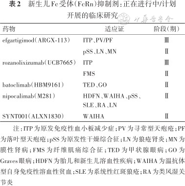 3.温抗体型自身免疫性溶血性贫血(warm antibody autoimmune hemolytic anemia,WAIHA):自身免疫性溶血性贫血主要是因为机体免疫功能紊乱形成自身红细胞抗体,并和红细胞表面相应抗原结合,伴或不伴补体激活,导致红细胞过早被破坏所致[19]。临床表现主要为贫血、黄疸和脾大。其中WAIHA约占80%以上,是最常见的类型[19],FcRn抑制剂在WAIHA中的临床研究尚处于起步阶段,评估SYNT001在WAIHA患者中的安全性和耐受性的Ⅰb期临床研究(NCT03075878)已经完成,结果尚未公布。nipocalimab在成人WAIHA中开展的一项多中心、随机、双盲、安慰剂对照、长期开放标签扩展的Ⅱ期临床研究(NCT04119050)已经启动,旨在评价nipocalimab在WAIHA的疗效和安全性。研究主要终点是达到血红蛋白持久改善的参与者的百分比,该研究目前处于招募状态。