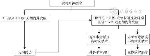 面神经瘤是一种生长缓慢的良性肿瘤,制定治疗方案需综合考虑肿瘤的大小及生长情况、患者的面神经功能和听力水平、有无颅内并发症、是否愿意手术以及能否耐受手术等多种因素。目前可以采取的治疗措施包括随访观察、外科治疗、立体放射治疗等,治疗原则及简明决策流程见图1。