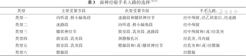 1. 手术入路:一般根据面神经的受累节段决定面神经瘤的手术入路,具体见表3[55, 56, 57]。