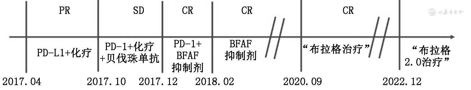 2017年4月于外院行“阿替利珠单抗1 200 mg 第1天(d1)+培美曲塞800 mg d2+卡铂700 mg d2,每3周1次(q3w)”一线治疗后部分缓解(PR);后予“阿特珠单抗1 200 mg d1,q3w”单药维持,但2周期后出现胸壁、腹壁转移;无进展生存期(PFS)为6个月。2017年10月予以“帕博利珠单抗100 mg d1+贝伐珠单抗400 mg d1,q3w”二线治疗共2周期;期间予右肺原发灶同步立体定向放射治疗,具体剂量50 Gy连续10次,疗效评估疾病稳定(SD);PFS为2个月。2017年12月予以治疗“帕博利珠单抗100 mg d1 q3w+曲美替尼2 mg每天1次+达拉非尼150 mg每天2次”三线治疗2周期后胸壁、腹壁病灶消失,疗效达完全缓解(CR);期间出现放射性肺炎及严重皮疹故予以停用免疫治疗;2018年2月继续口服“曲美替尼+达拉非尼”双靶向治疗,至2020年8月PET-CT评估纵隔淋巴结(2L、4R、8区)及腋窝淋巴结多发转移且肿瘤指标升高;PFS为32个月。