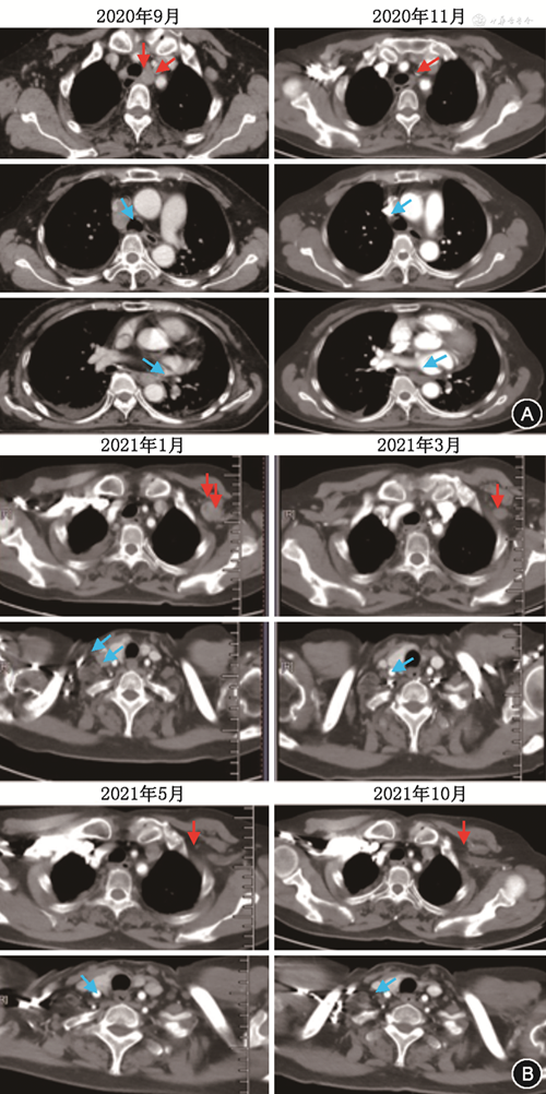 该患者“布拉格治疗”分为4个阶段:免疫激活(治疗模式:放疗+PD-1抑制剂+GM-CSF)、免疫巩固(治疗模式:PD-1抑制剂+GM-CSF)、免疫维持(治疗模式:PD-1抑制剂)、随访观察。第1、2周期分别给予纵隔(2 L)转移淋巴结大分割放疗(5 Gy照射连续3 d,每天1次),皮下注射GM-CSF(200 μg,指第4天至第17天,每天1次),静脉注射PD-1抑制剂(信迪利单抗200 mg,d4),该三联治疗方案每3周重复1次,每2个周期进行1次影像学评估,第3周和第4周期给予GM-CSF和PD-1抑制剂维持2周期;第5、6周期分别给予左腋窝转移淋巴结大分割放疗(5 Gy照射连续3 d,每天1次),并联合GM-CSF和PD-1抑制剂治疗(治疗同上),后续按治疗计划进入免疫巩固、维持、随访阶段。经过6周期“布拉格治疗”后,根据实体肿瘤反应评价标准(RECIST 1.1),该患者影像学评估为CR(图2)。此外,血清癌胚抗原(CEA)和糖类抗原125(CA125)水平降至正常范围。2022年12月患者出现双侧颈部淋巴结转移,PFS达26个月。后续该患者继续接受“布拉格治疗”2.0方案治疗[大分割放疗联合PD-1抑制剂序贯GM-CSF及白细胞介素-2(IL-2)治疗晚期难治性实体瘤的前瞻性多中心临床研究,注册号:NCT 04892498]。经1个治疗周期,患者于2023年2月1日再获评估疗效CR,截至2023年9月,该患者治疗仍在进行,疗效保持CR。治疗过程中出现了2级发热和短暂低氧血症,评估与GM-CSF治疗相关,经口服塞来昔布(200 mg,每天2次)和吸氧治疗后自行缓解。2020年11月10日被诊断为2级免疫相关性葡萄膜炎和1级甲状腺功能减退,予以小剂量糖皮质激素和甲状腺素替代治疗后恢复正常。不良事件均未明显降低患者的生活质量。