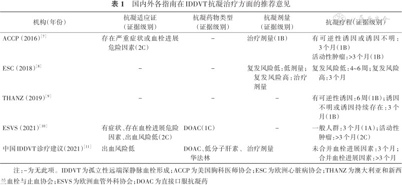 国内外各指南在IDDVT抗凝治疗方面的推荐意见
