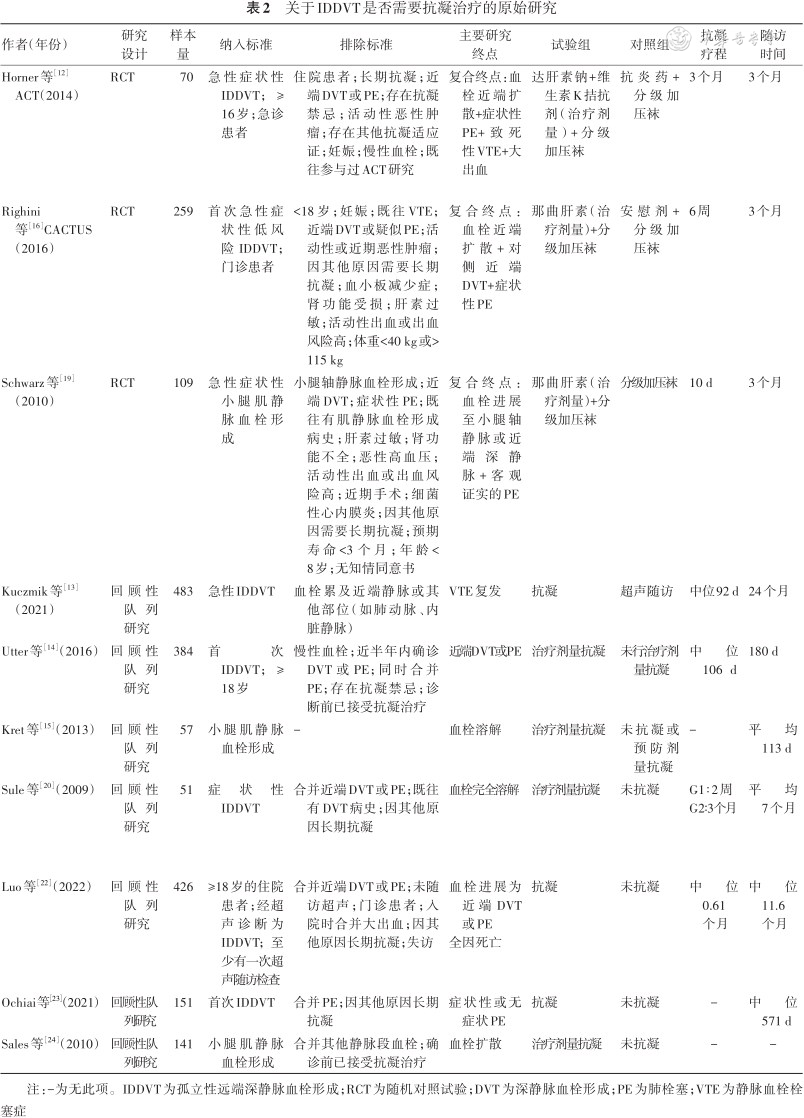 2.不支持抗凝:CACTUS研究[16]是一项仅纳入门诊低风险(无活动性癌症及VTE既往史)IDDVT患者的RCT(表2)。该研究表明,抗凝组与安慰剂组间主要结局(包括IDDVT近端扩散、对侧近端DVT、症状性肺栓塞的复合结局)发生率差异无统计学意义(3%比5%,P=0.54),但抗凝组出血风险较安慰剂组明显升高(4%比0,P=0.025 5)。另外,该研究在后续随访中发现[17, 18],抗凝治疗并不能减轻IDDVT患者的疼痛症状,也无法预防血栓后综合征的发生。