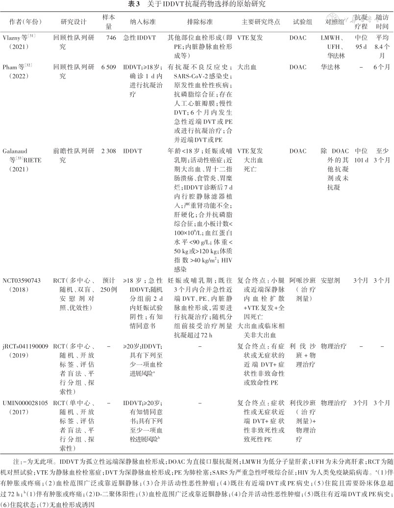 目前抗凝药物主要包括肝素类(如普通肝素、低分子肝素、磺达肝葵钠)、维生素K拮抗剂(如华法林)和直接口服抗凝药(direct oral anticoagulant,DOAC),如利伐沙班、阿哌沙班、依度沙班、达比加群。下表总结了不同抗凝药物治疗IDDVT的相关研究(表 3)。