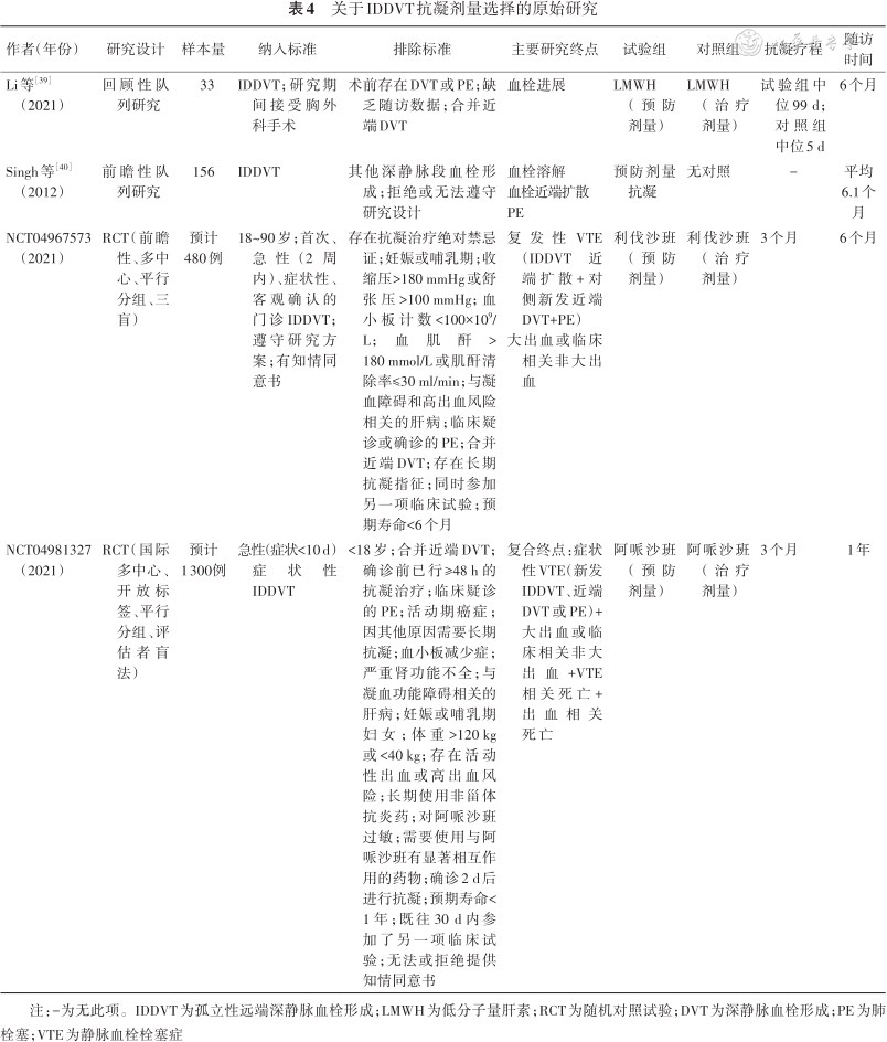 与2016年ACCP[7]一致,2021年中国IDDVT诊疗建议[11]推荐对IDDVT使用治疗剂量进行抗凝。而2018年欧洲心脏病协会(ESC)[8]认为抗凝剂量应取决于VTE复发风险,推荐对复发风险高者采用治疗剂量抗凝,对复发风险低者采用低剂量抗凝。总之,针对IDDVT抗凝剂量方面的研究很少,但目前已开展多项RCT(NCT04967573、NCT04981327)对比预防剂量与治疗剂量在IDDVT中的有效性及安全性(表4),它们有望为IDDVT抗凝剂量的选择提供更强有力的证据。