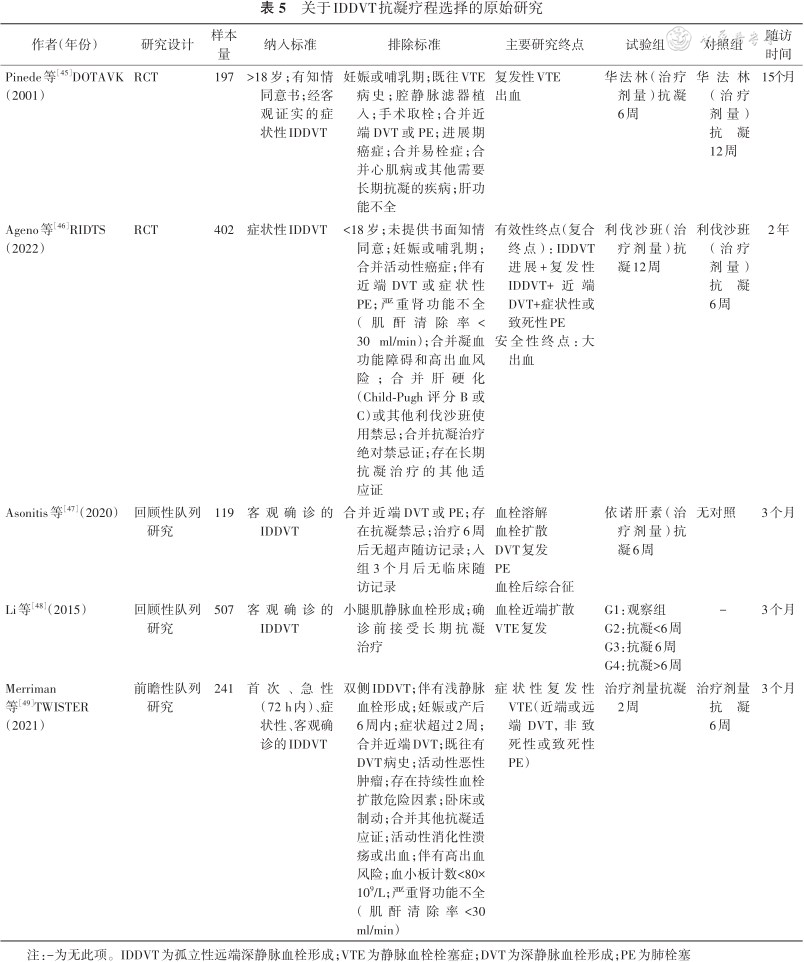 一项纳入了4项研究(3项RCT+1项队列研究)的荟萃分析[30]表明,与接受6周抗凝治疗的IDDVT患者相比,接受>6周抗凝治疗的患者VTE复发率更低(OR:0.39,95%CI:0.17~0.90)。需要注意的是,此荟萃分析纳入的原始研究数量少,总样本量仅1 243例,结论可靠性有待证实。