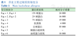 目前,荞麦致敏蛋白的命名采用世界卫生组织/国际免疫学联合会(WHO/IUIS)过敏原命名委员会的命名原则统一进行,过敏原名称由种属的前3个字母、物种分型的1个字母以及1个阿拉伯数字(即被分离鉴定的顺序)组成。甜荞中主要的致敏蛋白为Fag e 1(13S球蛋白)、Fag e 2(2S球蛋白)、Fag e 3(7S球蛋白)、Fag e 4(抗菌肽)、Fag e 5(豆球蛋白)等[18]。其中Fag e 1和Fag e 2是甜荞的主要致敏蛋白,具有胃蛋白酶稳定性,在荞麦过敏的诊断中具有高特异度[18,19]。Yanagida等[20]发现,Fag e 3可作为预测口服激发试验(OFC)阳性以及OFC过程中发生严重过敏反应的指标。Geiselhart等[21]于2018年发表的研究中发现了Fag e 4和Fag e 5这2种新的荞麦致敏蛋白,在荞麦过敏的诊断中也具有较高的特异度。