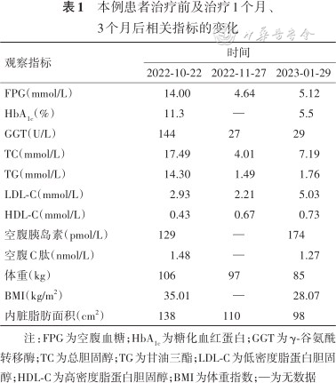 结合病史及辅助检查结果患者明确诊断为T2DM、肥胖、高脂血症。患者中心性肥胖,严重脂代谢异常,胰岛素C肽释放试验提示高胰岛素血症、胰岛素分泌延迟、IR。结合患者特点,治疗主要目标是改善糖脂代谢,减轻体重。故给予治疗方案如下。(1)糖尿病知识宣教,低脂糖尿病饮食指导。(2)控糖降脂药物方案:利拉鲁肽(1.2 mg,1次/d)、二甲双胍缓释片(1.0 g,2次/d)、阿卡波糖(50 mg,3次/d)、非诺贝特胶囊(0.2 g,1次/d)。随访:患者应用1个月时建议将利拉鲁肽加量至1.8 mg/d皮下注射,但患者有明显胃肠道反应,继续维持1.2 mg/d治疗2个月,于2022年11月底因自觉每日注射针剂麻烦自行停用,2022年12月至2023年1月通过饮食、运动控制,单药服用二甲双胍缓释片(1.0 g,2次/d)治疗。2023年1月29日复诊发现患者胆固醇水平有所升高,血糖控制良好,仍建议继续应用利拉鲁肽,维持1.2 mg,1次/d。出院后1、3个月复测体重逐渐下降21.0 kg。血糖、血脂明显改善,体重下降,体力明显改善,耳鸣、头晕症状好转。患者治疗前及治疗1、3个月后相关指标的变化如表1。