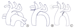 2例患儿采用了两种不同的手术方法矫治,其中1例术后随访至今4年余无狭窄,而另1例术后6个月出现再狭窄给予经皮球囊扩张治疗。1例进行染色体检查后发现异常,家属放弃治疗死亡。1例合并复杂的主动脉及其分支变异:右侧PFAA合并右侧第四主动脉弓中断,伴迷走左锁骨下动脉及左弓残端Kommerell憩室。