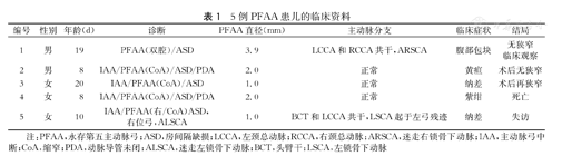 回顾性分析5例PFAA患儿的临床资料,包括性别、年龄、体重、临床特征、超声心动图检查、CTA检查、手术记录以及门诊或电话随访资料。总结分析PFAA解剖特征、鉴别诊断、手术方法及随访情况。