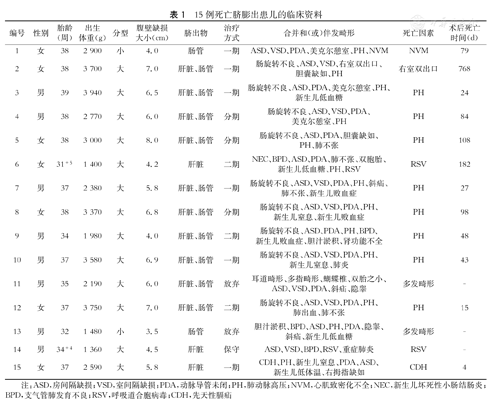 先天性脐膨出是一种新生儿腹壁严重缺损的先天畸形,发生率为1/6 000,根据腹壁缺损大小以及膨出物,可分为巨型脐膨出和小型脐膨出[1]。临床上,腹壁缺损直径≥5 cm,或者有肝脏膨出者定义为巨型脐膨出;腹壁缺损直径<5 cm,定义为小型脐膨出[2,3]。治疗方式包括保守治疗和手术治疗。脐膨出患儿常合并或伴发较多畸形,例如:先天性心脏病(心肌致密化不全、右室双出口、房间隔缺损、室间隔缺损、肺动脉高压、动脉导管未闭等)、肠旋转不良、骨骼畸形、先天性膈疝、Beckwith-Wiedemann综合征等[4]。单发的脐膨出患儿预后较好,伴有复杂畸形的患儿预后较差,有较高的死亡风险,如何有效降低患儿死亡是临床医生面临的一个难题,本文对15例死亡的脐膨出患儿临床资料进行分析,总结经验为脐膨出患儿提供更好的治疗方案。