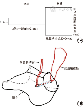 用4.0克氏针于跟腱止点处进针,向内斜45°穿出跟骨,形成直径约0.5 cm骨隧道,测量克氏针进出点间距离(S)。设计“T”型阔筋膜样布(图1A):“T”型的横轴,长度为跟腱缺损长度+2 cm,宽度为3倍跟腱断端宽;“T”型的纵轴,宽度为1.5 cm,长度为2 S+横轴长度。彩色多普勒检查定位跟腱缺损处胫后动脉分支,在样布上对应位置标记。
