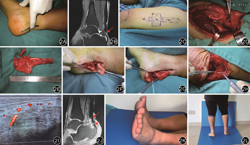 游离阔筋膜后,将纵轴浆膜面朝外卷曲2~3圈直至能从骨隧道穿入,阔筋膜纵轴穿出隧道后调整位置重合跟腱力线方向,拉扯阔筋膜使横轴顶住跟腱止点处(图1B),纵轴断端采用3-0肌腱线与横轴锁边缝合。横轴将浆膜面朝外卷曲2圈,形成与跟腱断端粗细接近“圆柱体”,多出的2 cm阔筋膜包裹跟腱断端,予跟腱线锁边+间断缝合固定。将阔筋膜内穿支血管与预留的胫后动脉分支及伴行静脉吻合,重建阔筋膜血供。松止血带观察阔筋膜渗血情况,渗血良好提示阔筋膜瓣血管蒂通畅性良好,切取成功,缝合皮肤。供区直接缝合。