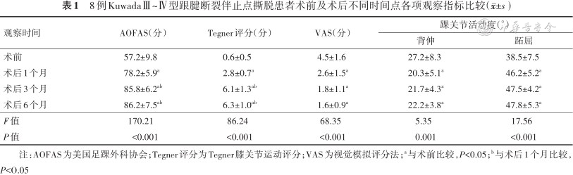 8例KuwadaⅢ~Ⅳ型跟腱断裂伴止点撕脱患者术前及术后不同时间点各项观察指标比较(±s )