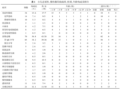 小儿迁延性、慢性腹泻病病因、性别、年龄构成及转归