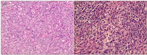 注:(A)×40; (B)×100;成年型卵巢颗粒细胞瘤(弥漫型)组织病理显示,瘤细胞为梭形或多角形,弥漫分布,排列紧密,细胞核卵圆形或圆形,可见纵行核沟,染色质呈细网状,瘤细胞周围纤维结缔组织少