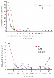 在进行流式细胞术免疫微小残留病(MRD)监测中,选择有连续治疗经过和免疫表型的2例B/M-MAPL患者,收集和分析患者免疫微残留监测B系和髓系的变化,见图1。