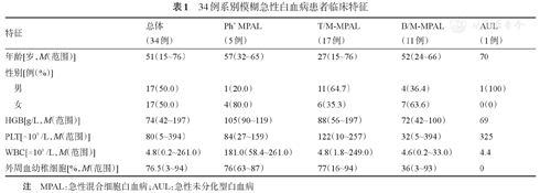 | 特征 | 总体(34例) | Ph+ MPAL(5例) | T/M-MPAL(17例) | B/M-MPAL(11例) | AUL(1例) |