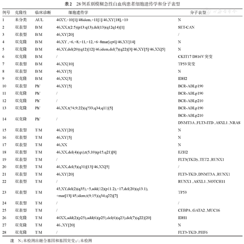 28例系别模糊急性白血病患者细胞遗传学和分子表型