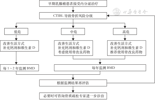 1.预防和治疗策略:(1)低危患者:建议改善生活方式、补充钙剂和维生素D。(2)中危患者:建议改善生活方式、补充钙剂和维生素D,考虑使用骨改良药物。(3)高危患者:建议改善生活方式、补充钙剂和维生素D,同时使用骨改良药物。早期乳腺癌CTIBL的预防和治疗临床推荐路径见图1。