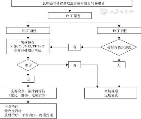 早期诊断对于乳腺癌分期、SREs的预防和治疗都很重要,有助减少和缓解SREs对患者的不良影响。当患者出现以下情况时,需怀疑是否出现骨转移:(1)骨痛或骨折;(2)脊髓或神经受压症状;(3)血碱性磷酸酶升高;(4)高钙血症[76]。乳腺癌骨转移的诊断需要结合病史、症状、体征、实验室检查等共同判断,影像学检查是主要的诊断手段,必要时可以进行骨活检。