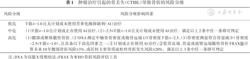 4.骨丢失和骨质疏松的风险分级:根据BMD、FRAX工具和临床因素,CTIBL导致骨折的风险分级见表1。