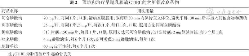 2.预防和治疗的具体内容:(1)改善生活方式:所有患者均应改善生活方式,生活方式的干预是早期乳腺癌患者防治CTIBL的基础[21,23]。①调整饮食结构:建议摄入含钙丰富的食物,增加多种蔬菜、水果摄入,选择全谷物或高纤维食物,每周至少食用两次鱼,限制反式不饱和脂肪酸、饱和脂肪酸、酒精、胆固醇和糖的摄入,避免过量饮用咖啡和碳酸饮料;②运动:每周至少坚持150 min中等强度的有氧运动,如慢跑、走路、游泳、骑车、跳舞等,绝经后女性应每周至少进行两次肌肉张力锻炼,但要注意防止跌倒和身体撞击[21]。可增加光照以促进体内维生素D的合成;③减重或保持体重:通过运动、控制饮食和行为训练维持或减轻体重,保持体质指数(body mass index,BMI)≥20 kg/m2且≤24 kg/m2,且腰围<80 cm;④戒烟戒酒:因为抽烟会增加骨质疏松的风险,酒精的摄入也会影响患者的BMD。鼓励患者不吸烟、避免吸二手烟、戒酒。