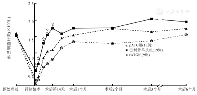pATG组受者术后第1、3、7、10、14天时淋巴细胞绝对计数分别为(0.17±0.07)×109/L、(0.27±0.14)×109/L、(0.85±0.40)×109/L、(1.05±0.56)×109/L、(1.10±0.56)×109/L,rATG组分别为(0.69±0.04)×109/L、(0.18±0.21)×109/L、(0.57±0.44)×109/L、(0.67±0.45)×109/L、(0.81±0.46)×109/L,两组各时间点淋巴细胞绝对计数均较巴利昔单抗组[(0.46±0.18)×
