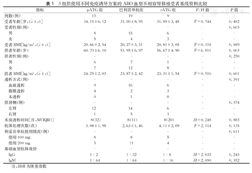 3组受者在年龄、性别、体重指数(body mass index,BMI)、透析方式、透析时间、左右供肾、血型抗体处理次数、利妥昔单抗使用剂量、基础血型抗体效价(IgG和IgM)以及受者、供者的性别和BMI等方面比较,差异均无统计学意义(P值均>0.05,表1)。pATG组供者年龄(60.23±6.10)岁较巴利昔单抗组(51.95±6.97)岁大,差异有统计学意义(P=0.002,表1);而rATG组分别与pATG组和巴利昔单抗组比较,差异均无统计学意义(P值均>0.05,表1)。