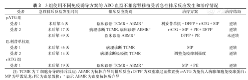 3组使用不同免疫诱导方案的ABO血型不相容肾移植受者急性排斥反应发生和治疗情况