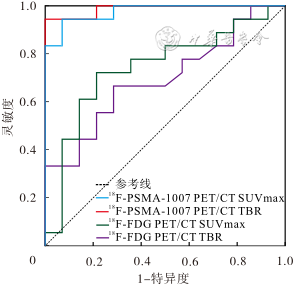 注:PET为正电子发射体层摄影;18F-PSMA为18F-前列腺特异性膜抗原;18F-FDG为18F-脱氧葡萄糖;SUVmax为最大标准摄取值;TBR为肿瘤/背景比值;AUC为曲线下面积;CI为可信区间