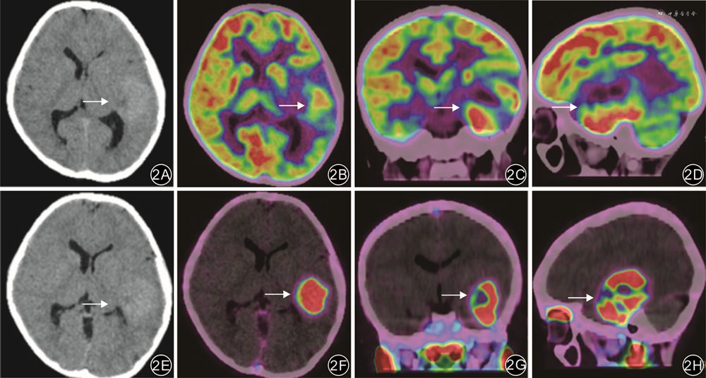 以正常脑灰质为对照,18F-PSMA-1007 PET/CT图像上HGG组和LGG组清晰显示病灶边界的病例数均高于18F-FDG PET/CT,差异均有统计学意义(P值均<0.05)。见表3。典型病例见图2。