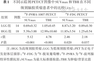 注:HGG为高级别胶质瘤;LGG为低级别胶质瘤;PET为正电子发射体层摄影;18F-FDG为18F-脱氧葡萄糖;18F-PSMA为18F-前列腺特异性膜抗原;SUVmax为最大标准摄取值;TBR为肿瘤/背景比值