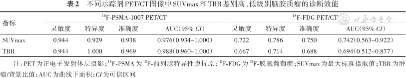 不同示踪剂PET/CT图像中SUVmax和TBR鉴别高、低级别脑胶质瘤的诊断效能