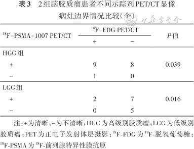 注:+为清晰;-为不清晰;HGG为高级别胶质瘤;LGG为低级别胶质瘤;PET为正电子发射体层摄影;18F-FDG为18F-脱氧葡萄糖;18F-PSMA为18F-前列腺特异性膜抗原