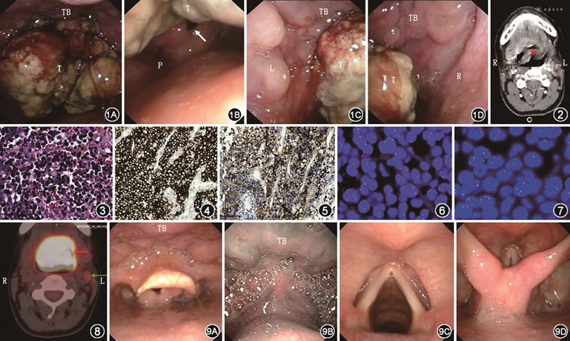 患者女,50岁,因“咽部异物感2个月,进行性加重1个月伴活动后气紧、吞咽困难、张口困难、痰中带血”于2022年12月29日收入华西医院耳鼻咽喉头颈外科。2个月前患者于当地医院喉镜发现会厌舌面新生物,表面黏膜光滑,未取得活检。1个月后,症状加重,复查纤维鼻咽喉镜提示会厌菜花样新生物,部分阻挡喉入口,表面灰白色坏死组织,触之易出血(图1)。活检提示中等大小细胞伴弥漫分布,肿瘤可能。CT见口咽、喉咽不规则软组织肿块,大小3.5 cm×3.2 cm,增强可见不均匀强化,双侧颈部淋巴结显示,左侧颈鞘淋巴结稍大(图2)。因患者呼吸困难加重,急诊入院行气管切开、支撑喉镜下喉肿物活检术。术后病理诊断为淋巴组织弥漫增生伴灶性坏死,增生的主要是体积中等偏大至大的淋巴样细胞,免疫组织化学(图3, 4, 5)示肿瘤细胞CD20(+),CD79a(+),CD5(-),CD3(-),CD10(+),Bcl-6(+),Mum-1(-),CD23(-),CD56(-),CyclinD-1(-),SOX11(-),TdT(-),GB(部分+),Bcl-2(-),C-MYC(+,80%),P53(+,20%),Ki679(+,>90%)。EB病毒编码小RNA(Epstein-Barr virus-encoded small RNA,EBER)1/2原位杂交(+,约80%)。基因重排(PCR+GENESCAN)检测查见IgH及IgK克隆性扩增峰,未查见T细胞受体伽马(T cell receptor gamma,TRG)扩增峰。荧光原位杂交(fluorescence in situ hybridization,FISH):检出C-MYC基因异位。检出C-MYC::IGH[c-MYC/immunoglobulin heavy-chain(IGH),c-MYC/免疫球蛋白重链]基因融合(图6、7)。综合FISH、形态学及免疫组化检测结果,病理诊断为非霍奇金淋巴瘤,侵袭性B细胞淋巴瘤,符合Burkitt淋巴瘤(WHO,高度侵袭性)。EB病毒定量实时荧光检测:2.49×104 copies/ml。人体免疫缺陷病毒(human immunodeficiency virus,HIV)初筛阴性。完善正电子发射断层显像X线计算机体层成像(positron emission tomography computed tomography,PETCT)检查提示会厌区软组织肿块,伴糖代谢增高,符合淋巴瘤表现。左上颈部淋巴结病变,倾向淋巴瘤累及,右肺中叶结节糖代谢增高,淋巴瘤可疑累及(图8)。根据病理结果给予第一周期R-CHOP化疗方案,具体为利妥昔单抗500 mg(d0)+环磷酰胺1 000 mg(d1)+吡柔比星70 mg(d1)+长春地辛4 mg+泼尼松100 mg(d1~d5),q21d。后更换为R-EPOCH方案联合腰穿鞘注,具体为利妥昔单抗500 mg(d0)+依托泊苷70 mg(d1~d4),环磷酰胺1 000 mg(d5)+吡柔比星17 mg(d1~d4)+长春地辛1 mg(d1~d4)+泼尼松100 mg(d1~d5),q3w。腰椎穿刺+鞘注(阿糖胞苷100 mg+地塞米松5 mg)。第二周期化疗后出现Ⅳ°骨髓移植,并出现粒细胞缺乏性发热。第三次R-EPOCH方案依托泊苷、环磷酰胺、吡柔比星三种药物各减量25%。鞘注药物为甲氨蝶呤12 mg+地塞米松5 mg。住院期间患者出现发热,最高体温37.3 ℃,未经特殊处理体温自行下降。每次化疗结束后复查喉镜见会厌肿瘤体积缩小明显。第三次化疗后会厌黏膜光滑、解剖结构完整,窄带成像(narrow band imaging,NBI)早癌筛查未见黏膜有异常血管影(图9)。复查PETCT全身未见淋巴瘤侵犯征象,化疗前PETCT检查所发现的左颈上份淋巴结及右肺中叶结节未见显示。