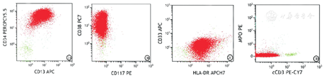 患者2,2021年7月20日入院后实验室检查结果如下。血常规检查结果示,WBC为18.05×109/L,红细胞计数为4.88×1012/L,Hb值为141 g/L,血小板计数为49×109/L,C反应蛋白值为83.68 mg/L;外周血生化检查结果示,丙氨酸转氨酶值为52.4 U/L,谷氨酰转肽酶值为289.2 U/L,天冬氨酸转氨酶值为65.4 U/L,碱性磷酸酶值为167.2 U/L,乳酸脱氢酶值为959 U/L;凝血功能结果示,纤维蛋白原值为4.46 g/L,抗凝血酶Ⅲ值为70.8%,D-二聚体值为2.9 mg/L;IgM值为2.39 g/L,血清β2微球蛋白值为4.72 mg/L。骨髓细胞形态学检查结果示,骨髓增生活跃,异常原始细胞占有核细胞比例为84.00%,该类细胞体积大小不等,部分形态不规则;细胞核类圆或者不规则,染色质颗粒状,部分可见核仁;细胞质量较少,着灰蓝色(图3)。幼稚粒细胞及成熟粒细胞少见。早期阶段红系细胞未见,偶见晚幼红细胞。红细胞形态未见明显异常。淋巴细胞数目无明显增减,形态大致正常。浆细胞可见,比例、形态均大致正常。全片未见巨核细胞。血小板少见。未见其他异常细胞及寄生虫。骨髓免疫分型结果示,异常原始细胞占有核细胞的比例为87.55%,表达CD7、CD38、CD99,小部分表达HLA-DR,部分表达CD34、CD33、CD123,小部分表达cCD3(阳性率为3.87%,细胞质抗体阳性率<10.00%),其余相关抗原均不表达(图4)。二代测序及细胞遗传学检查结果示AL相关43种融合基因突变筛查呈阴性;染色体核型正常。