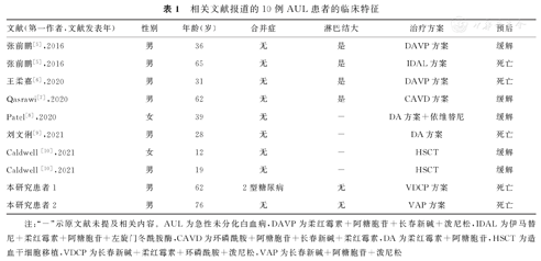 ①患者1因"乏力2个月,发热2 d,伴胸闷、憋气1 d"入本院治疗,患者1既往有"2型糖尿病"病史;曾于当地医院就诊,疗效不佳,遂转入本院进一步治疗。患者2因"发现颈部右侧肿物10+ d"入本院治疗,同时右侧颈部疼痛,转颈吞咽时加重,伴发热,偶有胸闷、憋气,伴咳嗽;无其他疾病史和家族史。②入院后,患者1相关检查结果示,白细胞计数(WBC)为108.34×109/L,红细胞计数为2.86×1012/L,血红蛋白(Hb)值为92 g/L,血小板计数为7×109/L;B型钠尿肽前体、降钙素原、C反应蛋白水平进行性升高;骨髓细胞形态学检查结果示,原始细胞比例为97.00%;骨髓细胞免疫分型结果示,异常原始细胞占有核细胞比例为98.12%,表达CD34、CD38、CD13、CD123,部分表达CD9,弱表达人类白细胞抗原(HLA)-DR,除表达CD13外,不表达其他髓系、B系和T系相关和特异性抗原。患者2相关检查结果示,WBC为18.05×109/L,红细胞计数为4.88×1012/L,Hb值为141 g/L,血小板计数为49×109/L;C反应蛋白值升高;骨髓细胞形态学检查结果示,粒系原始细胞比例为84.00%;骨髓细胞免疫分型结果示,异常原始细胞占有核细胞比例为87.55%,表达CD7、CD38、CD99,小部分表达HLA-DR,部分表达CD34、CD33、CD123,小部分表达cCD3(阳性率为3.87%,细胞质抗体阳性率<10.00%),其余相关抗原均不表达。③患者1于2020年8月27日被诊断为AUL,遂于9月1日对其采取VDCP[长春新碱1.5 mg/(m2·d),d1~8+柔红霉素45 mg/(m2·d),d1~3+环磷酰胺750 mg/(m2·d),d1+泼尼松1 mg/(kg·d),d1~4、8~11]方案化疗,28 d为1个疗程。其接受2个疗程VDCP方案化疗后,由于年龄大且基础疾病较重,病情迅速复发恶化,患者家属放弃治疗。患者1出院后,血小板计数呈下降趋势,并于2020年10月10日合并严重感染死亡。患者2于2021年7月28日被诊断为AUL。由于患者2年龄大,遂于7月30日对其采取减低剂量VAP[长春新碱1.5 mg/(m2·d),d1~8+阿糖胞苷100 mg/(m2·d),d1~6+泼尼松1 mg/(kg·d),d1~7]方案化疗,28 d为1个疗程。其接受1个疗程减低剂量VAP方案化疗后,疗效较差,家属放弃治疗。患者2出院后,病情恶化严重,并于2021年9月10日大出血死亡。④根据文献检索策略,共纳入6篇报道8例AUL患者相关文献,加上本研究患者1~2共10例AUL患者。对这10例患者的研究结果显示,>60岁患者为4例,9例患者无合并症,4例患者初诊时伴淋巴结大,2例接受造血干细胞移植(HSCT)后缓解,1例接受DAVP(柔红霉素+阿糖胞苷+长春新碱+泼尼松)方案化疗后缓解,1例接受CAVD(环磷酰胺+阿糖胞苷+长春新碱+柔红霉素)方案化疗后缓解,1例接受DA(柔红霉素+阿糖胞苷)+依维替尼方案化疗后缓解,5例患者死亡。