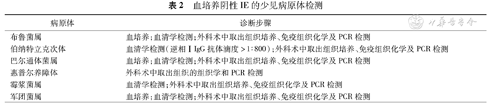 如血培养阴性,IE的发生率为2.5%~31%,因此常延误诊断和治疗,并对预后造成重大影响[17]。最常见原因是血培养前应用抗生素,建议停用抗生素并复查血培养,另一类常见的原因是病原体为苛养微生物等非典型病原体[18],易见于人工瓣膜、留置静脉导管、置入起搏器、肾功能衰竭或免疫抑制状态的患者。血培养阴性时应调整检测方法(表2)。