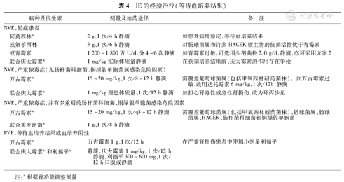 在血培养获得阳性结果之前采用,适用于疑似IE、病情较重且不稳定的患者。经验治疗方案应根据感染严重程度,受累心瓣膜的类型、有无少见或耐药菌感染危险因素等制订,分为自体瓣膜心内膜炎(native valve endocarditis,NVE)及人工瓣膜心内膜炎(prosthetic valve endocarditis,PVE)。治疗应覆盖IE最常见的病原体。经验治疗推荐的治疗方案见表4。