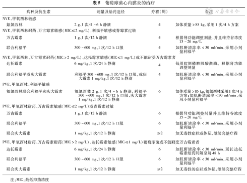 推荐治疗方案见表5。治疗方案宜根据病原菌是否属甲氧西林耐药株而定。由于青霉素耐药葡萄球菌已达90%以上,故在获知细菌药敏前经验治疗宜首选耐酶青霉素类,如苯唑西林或氯唑西林等联合氨基糖苷类。