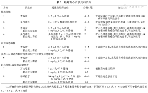 推荐治疗方案见表6。按照草绿色链球菌对青霉素的敏感程度,治疗方案略有差异。青霉素对草绿色链球菌最低抑菌浓度(MIC)≤0.125 mg/L者为敏感株,MIC>0.125 mg/L而≤0.5 mg/L者系相对耐药株,MIC>0.5 mg/L为耐药株。