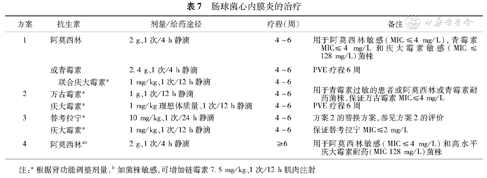 推荐治疗方案见表7。肠球菌属细菌对多种抗菌药物呈现固有耐药,一些有效药物单用仅具抑菌作用,须联合用药,达到杀菌作用并减少复发机会。粪肠球菌可对氨苄西林和青霉素呈现敏感,但其敏感性较草绿色链球菌差,屎肠球菌敏感性更低。