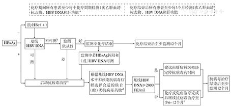 2.化疗期间,所有患者应至少每个化疗周期检测1次乙型肝炎血清标志物、HBV DNA和肝功能;化疗结束后,所有患者应至少每3个月检测1次乙型肝炎血清标志物、HBV DNA和肝功能。